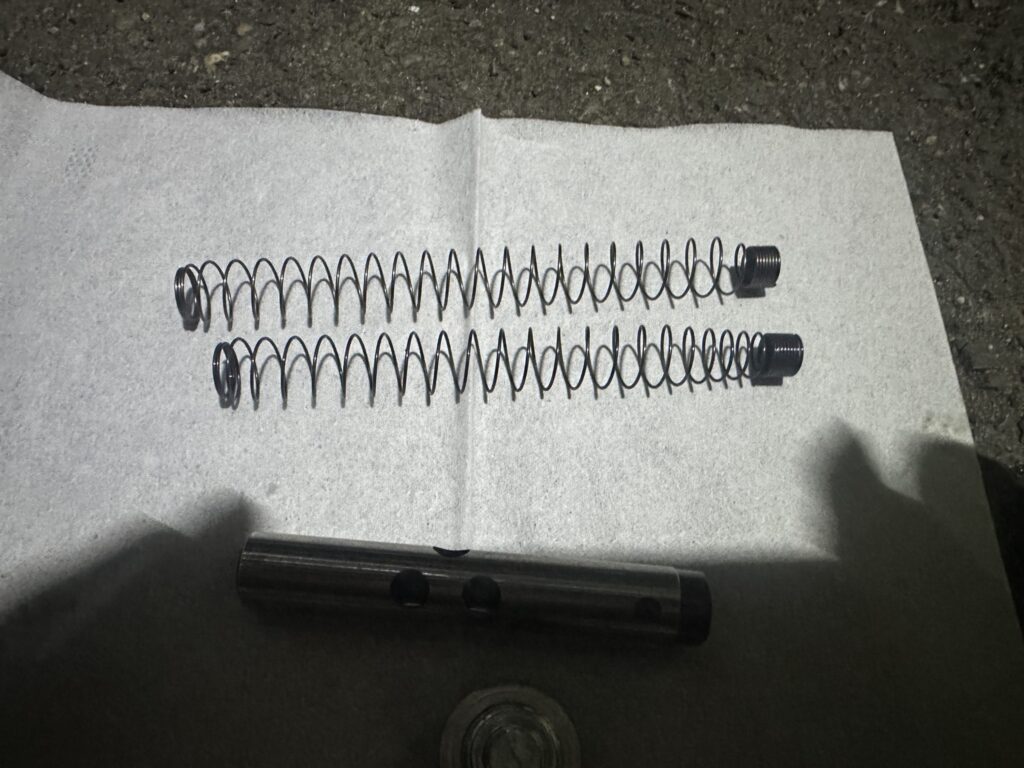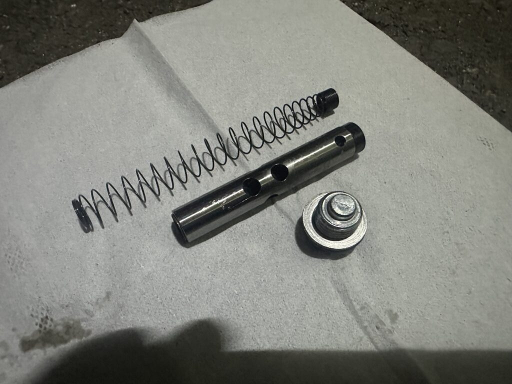 今回は、このドレンボルトのワッシャーと、スプリング、先端の黒いゴムを交換します。