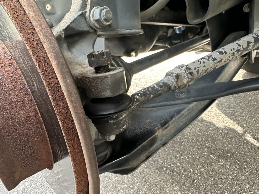 タイロッドエンドの割りピンを抜き、固定ナットを緩めます。割りピンは再使用せず新品に交換します。