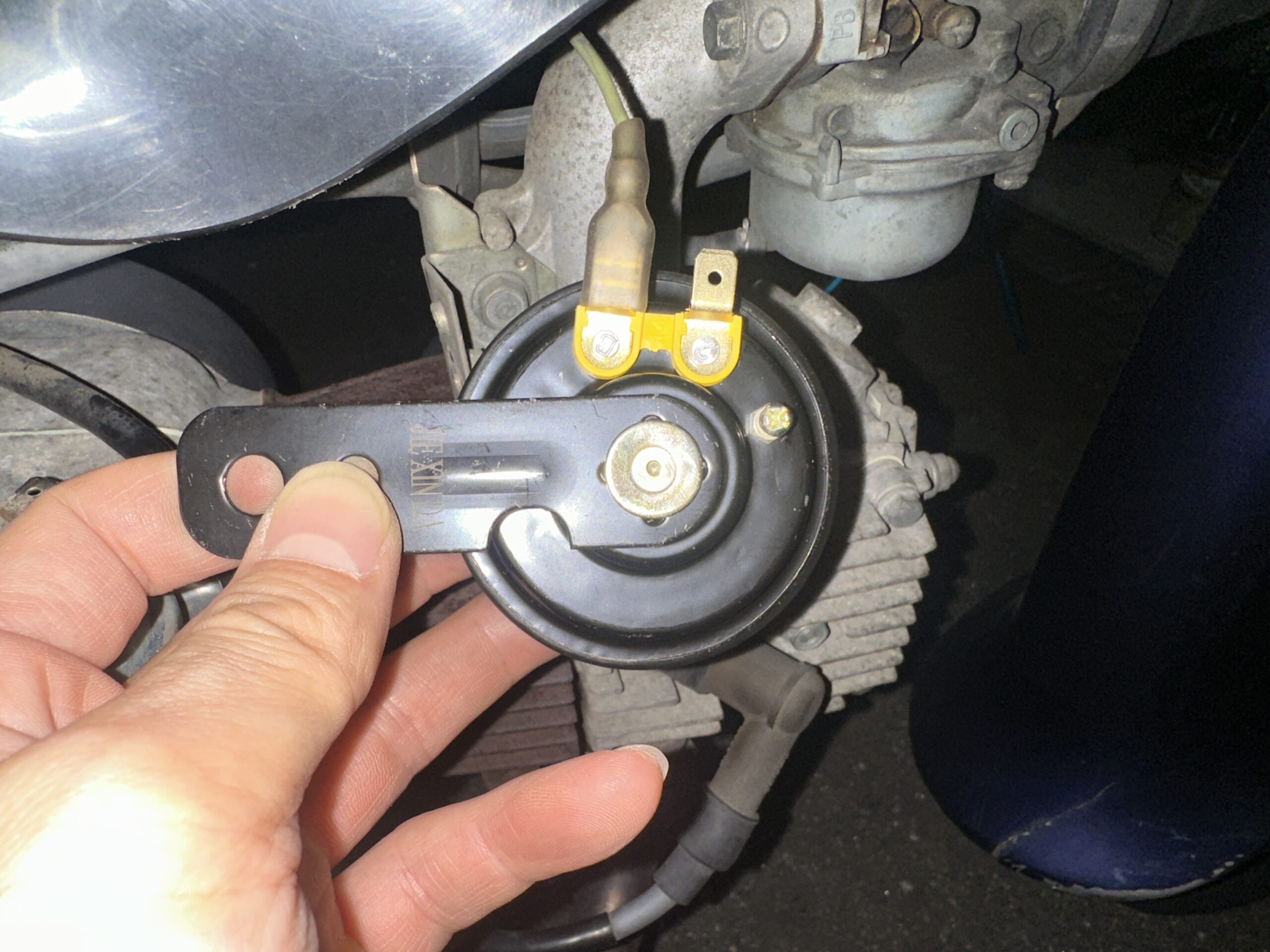 今回は、ホーンの本体を固定するボルトに共締めしました。(ホーンを取り外したときのボルトです)