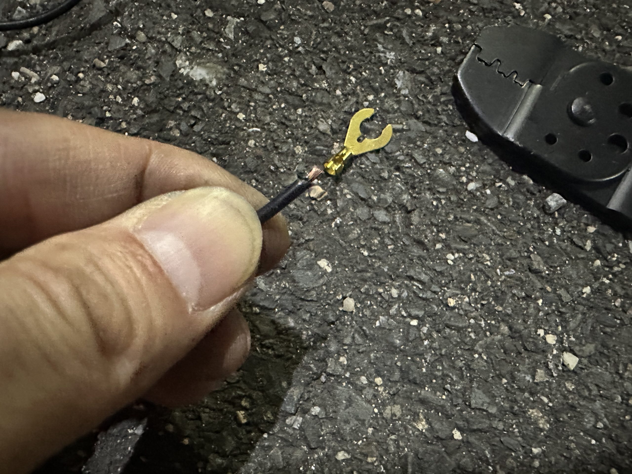 - ギボシ端子を使ってアース線を作ります。アースはハの字の端子を接続して、本体側は平端子のメスです。