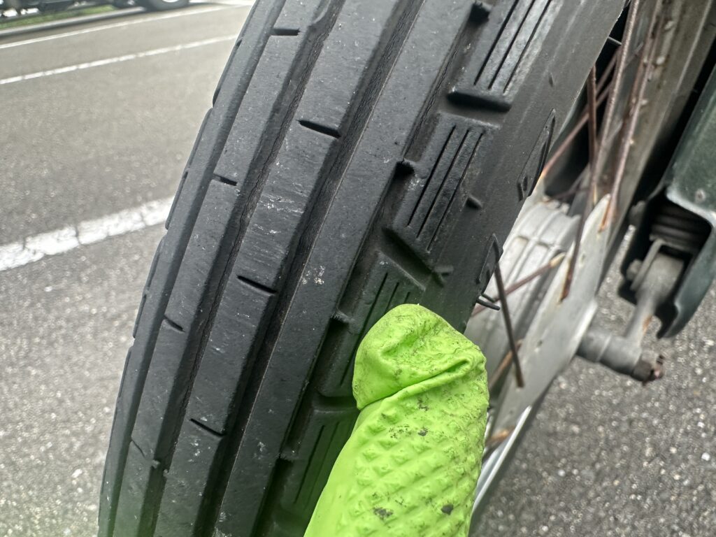 空気圧を測り、摩耗やひび割れがないかチェック。溝が1.6mm以下なら交換必須です。