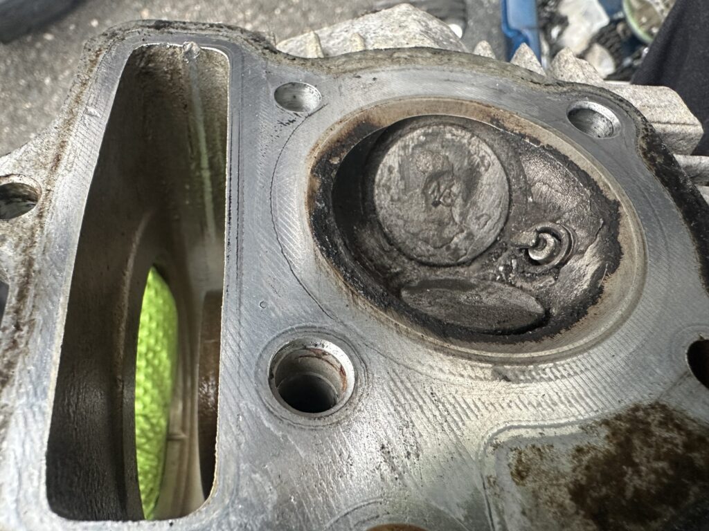 ヘッドは、カムチェーンの部分が若干削れているのがわかります。異音の原因は、この部分に当たっていたのでしょう。(写真左上)