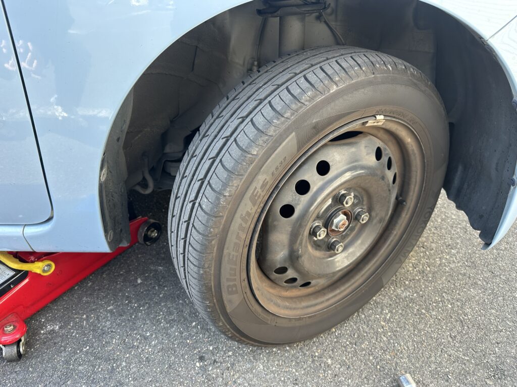 対象側の前輪をジャッキアップし、ウマをかけて安全を確保します。その後ホイールを外します。作業スペースを確保するため、ハンドルは作業側と少し逆に切っておくとやりやすいです。