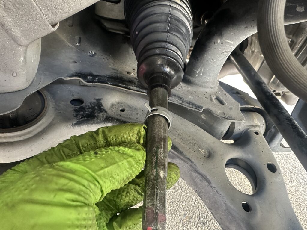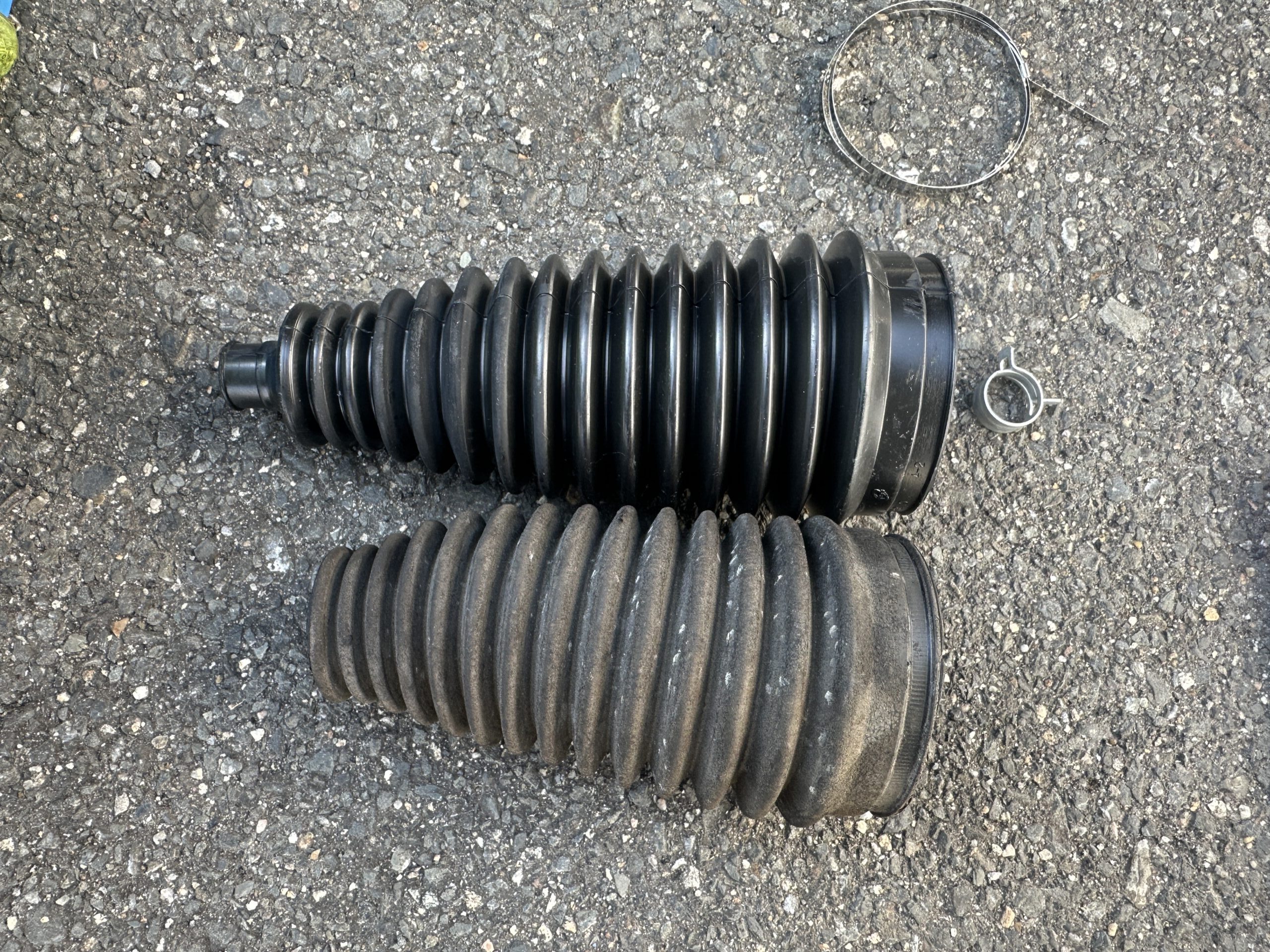 ラックブーツは、ステアリングラックの可動部を保護する蛇腹状のゴムカバーです。ここが破れると内部に水や砂が入り、グリスが流出して摩耗が進みます。放置するとラック本体の交換という高額修理につながるため、破れを見つけた時点で交換が基本です。