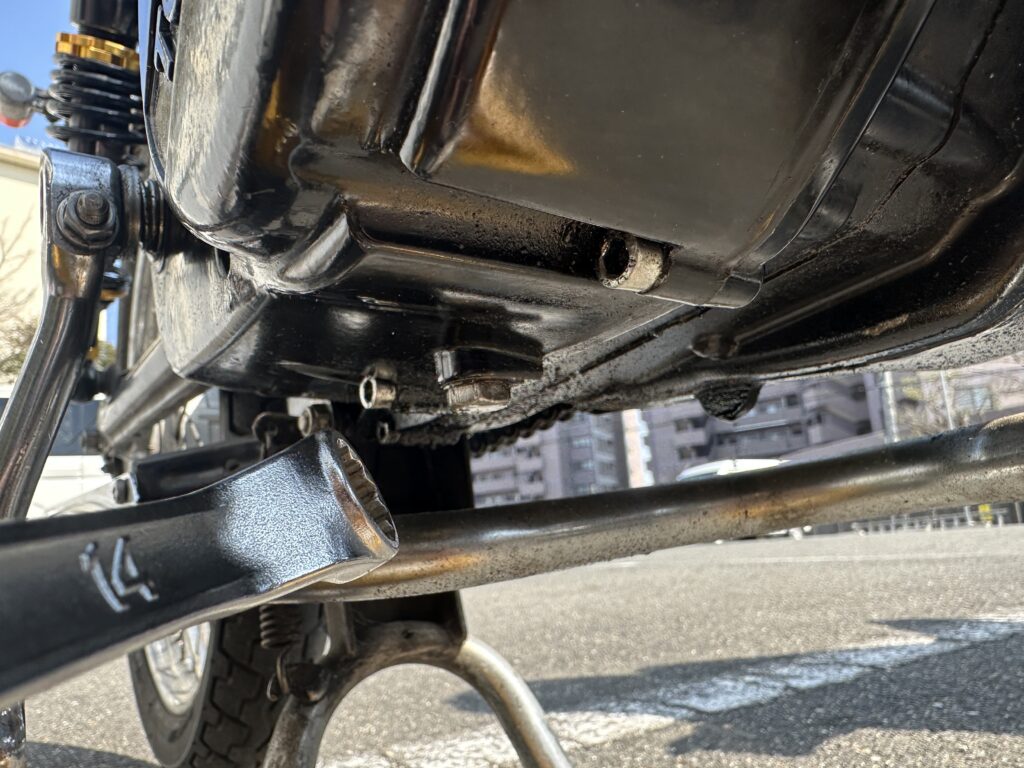 トモスは右側のステップを外せば、13mmのボルトが取り付けられています。